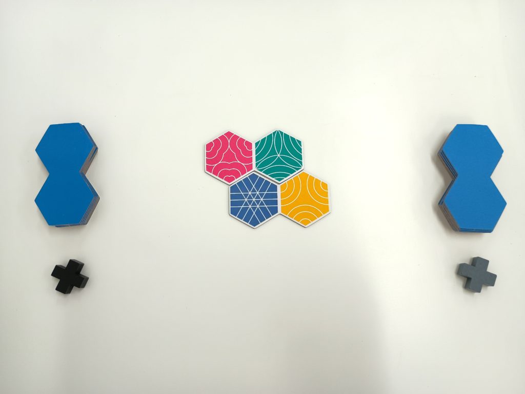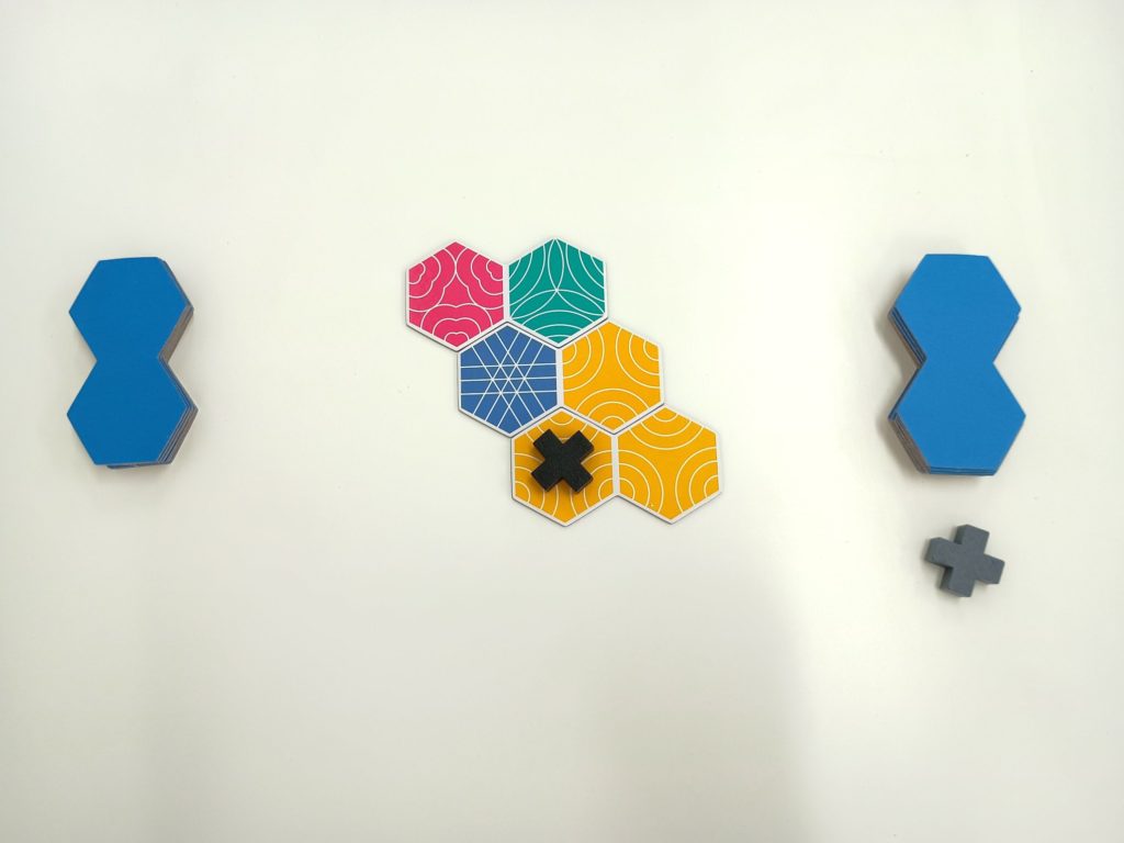 コネクタイルでは、4人まで遊ぶことができますが、今回はベーシックな2人対戦について紹介します。コネクタイルの手札は、六角形が2つ繋がった形になっており、そこに赤、青、黄、緑、紫、橙のいずれかの色が付いています。2色2人対戦の場合、各々12枚ずつのタイルを、手札としてランダムに配り、場には2枚のタイルを図のように並べます。ここからプレイヤーが順番に自分の手札のタイルを繋げていきます。