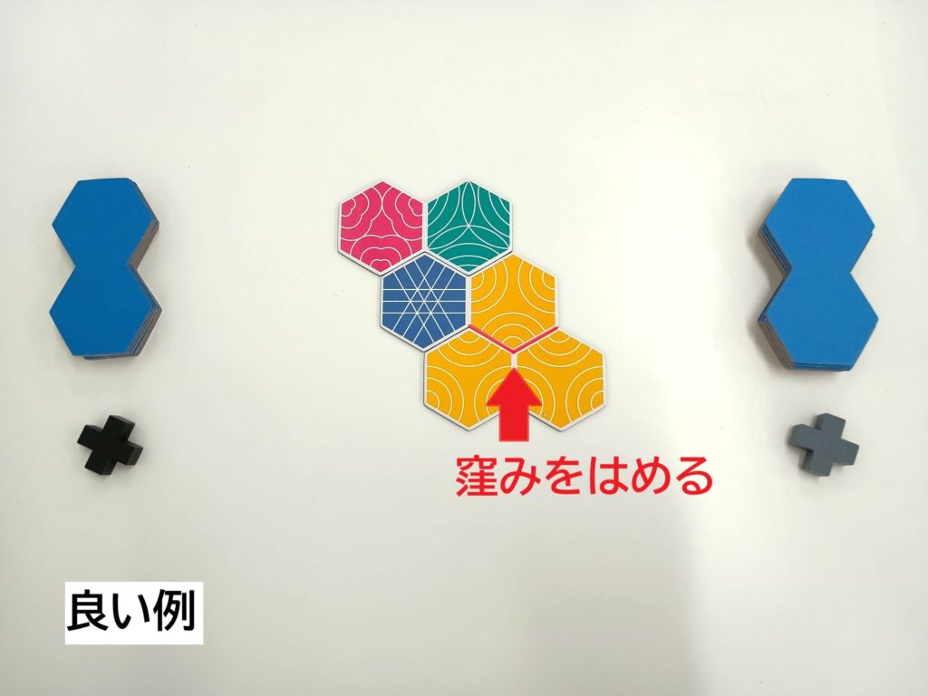 タイルの繋げ方にはルールがあります。タイルの窪み部分を必ずつなげなければいけません。左が良い例で、右が悪い例です。黄色2色のタイルを繋げるときに、良い例は窪み部分をはめていますが、悪い例は窪み部分がどこにもつながっていません。こういった繋げ方はできないため、注意が必要です。そして、繋がっている同じ色のマスの数だけその人の得点になります。今回の例では黄色が3つ繋がっているので3点です。