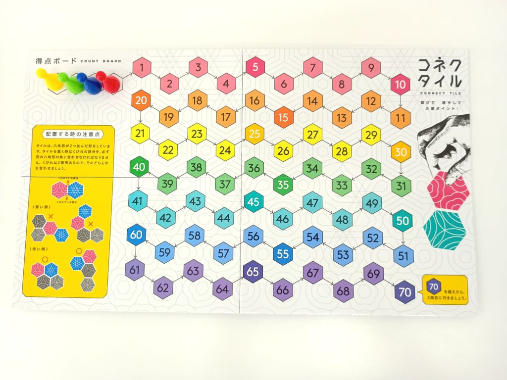 コネクタイルのルールは上記の通りですが、このゲームでもうひとつ工夫されているのが、点数の数え方です。右図のように、点数を取ることに、すごろくのように自分のコマを進めていくのです。点数の差がはっきりわかり、競いあっている感じも出るので、ゲームをより面白くしてくれていると思います。このように、コネクタイルは単純なルールで、何人でも遊べるので、ぜひプレイしてみてください。ネットでも購入できます。