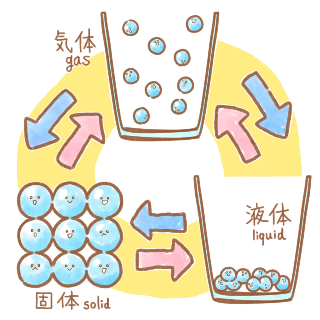 1年の化学の最後は状態変化についてです。物質は、加熱することで「個体→液体→気体」と状態が変わり、これを状態変化と言います。冷却すると、逆に「気体→液体→個体」と状態変化します。例えば水は「氷→水→水蒸気」と変化しますが、これは物質そのものや質量が変化するわけではなく、物質をつくる粒子の密度、物質の体積が変わるのです。