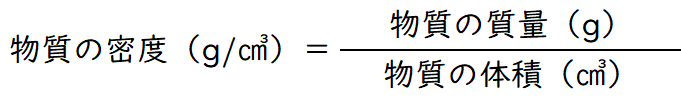 結局、密度は一定の決まった体積での質量を考えよう、というだけです。上の公式が密度の求め方ですが、難しく考える必要はありません。単純に、1㎤あたりの質量(g)を求める式なのです。小学生の算数「単位量あたりの大きさ」の考え方そのものです。
