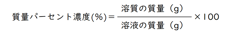 【例題】水200gに硝酸カリウム50gを溶かした水溶液の質量パーセント濃度は? → 20%(溶質50g÷溶液250g×100)