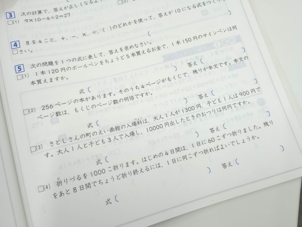 算数の文章問題で非常に多い間違いが、単位の付け忘れです。12人と答えるところを12と書いていたり、5cmなのに5だけ書いていたり、ほとんど正解なのにバツになってしまうのは、もったいないとしか言えません。「数字があっているからいいでしょ。」と考える子もいますが、もちろんダメです。普段から気を付けないと、テストで大きく点を失ってしまうかもしれません。